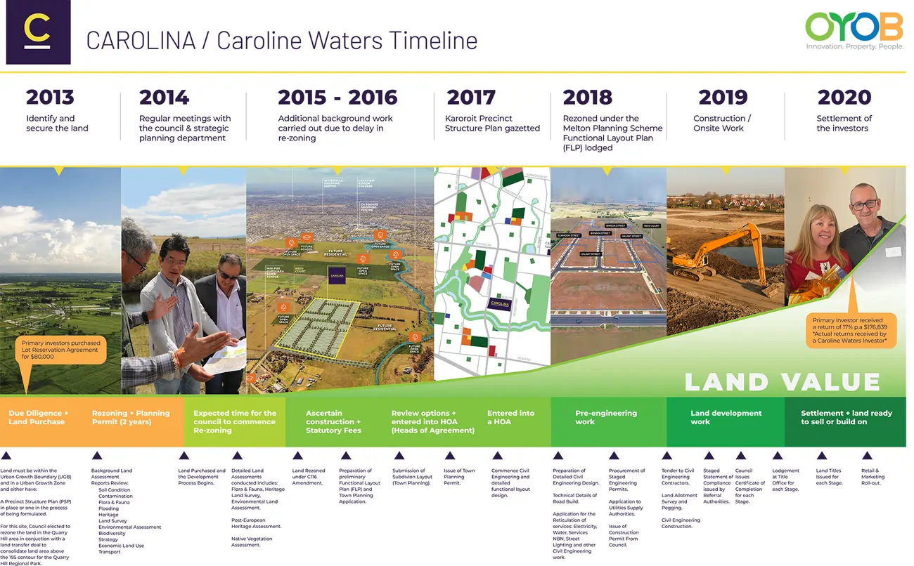 The Carolina Waters project began in 2013 with land acquisition and strategic planning, involving regular council meetings to ensure thorough preparation despite rezoning delays.